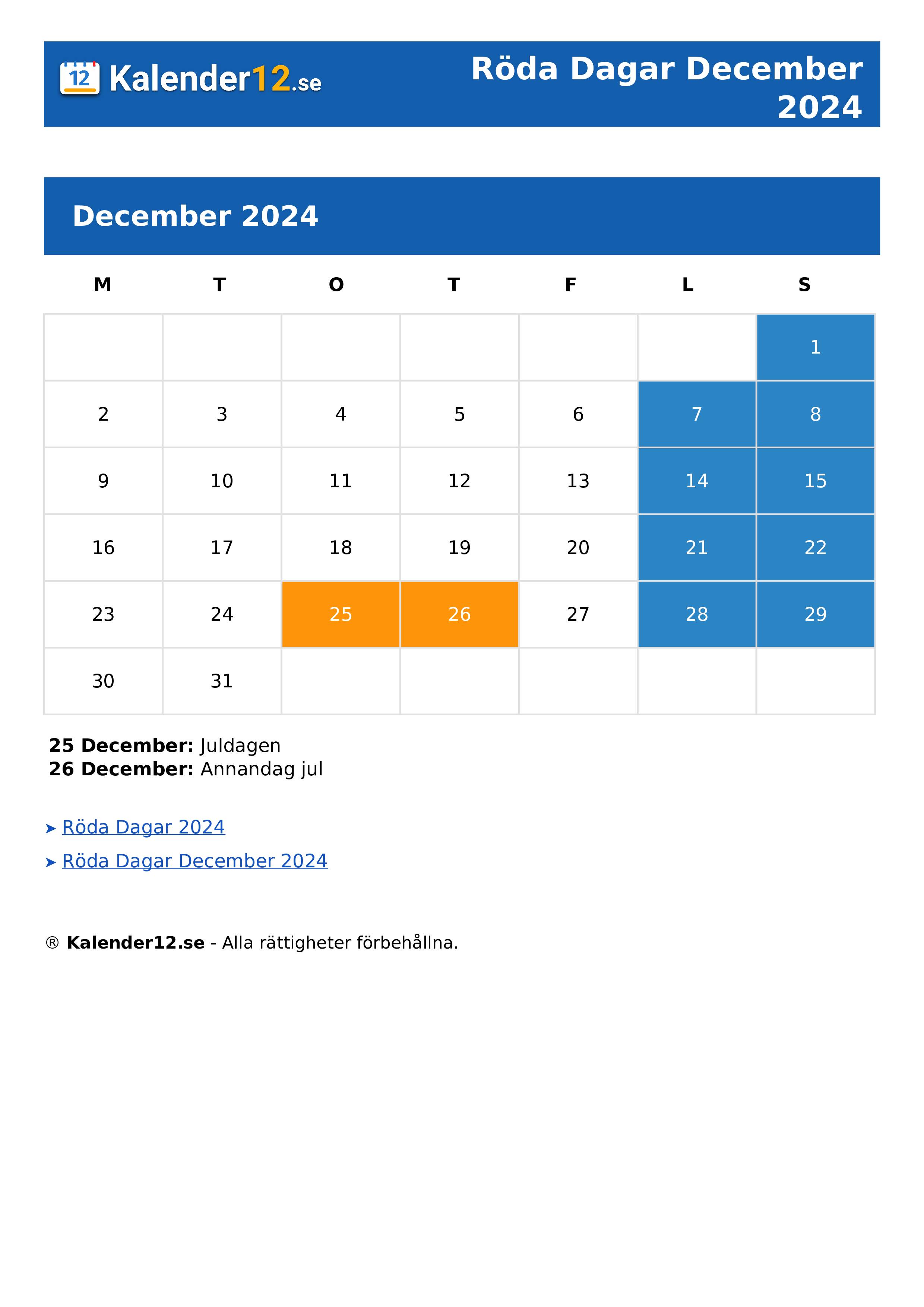 Röda Dagar December 2024 ⬅️ — Kalender12.se