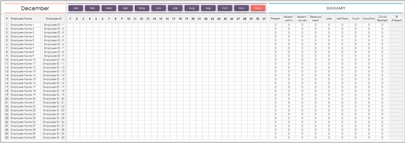 Employee Attendance Sheet Excel Template 1 100 Employees Etsy