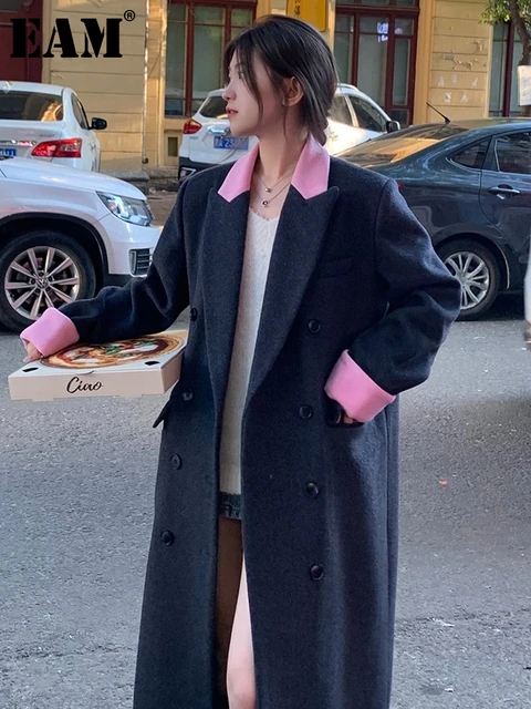 EAM] Loose Fit Gray Color block Big Size Woolen Coat New Lapel