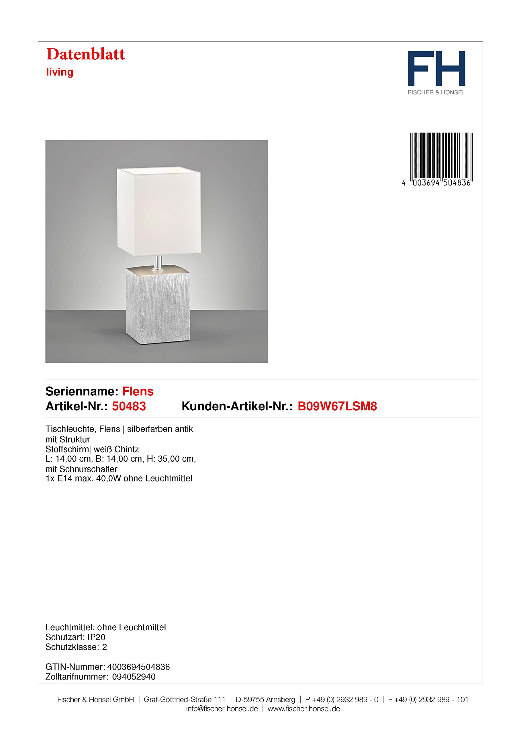 Fischer & Honsel Flens 50483 Table Lamp Antique Silver with Fabric