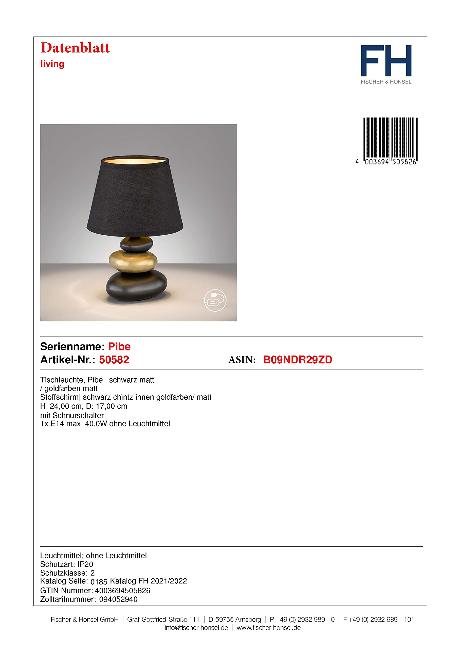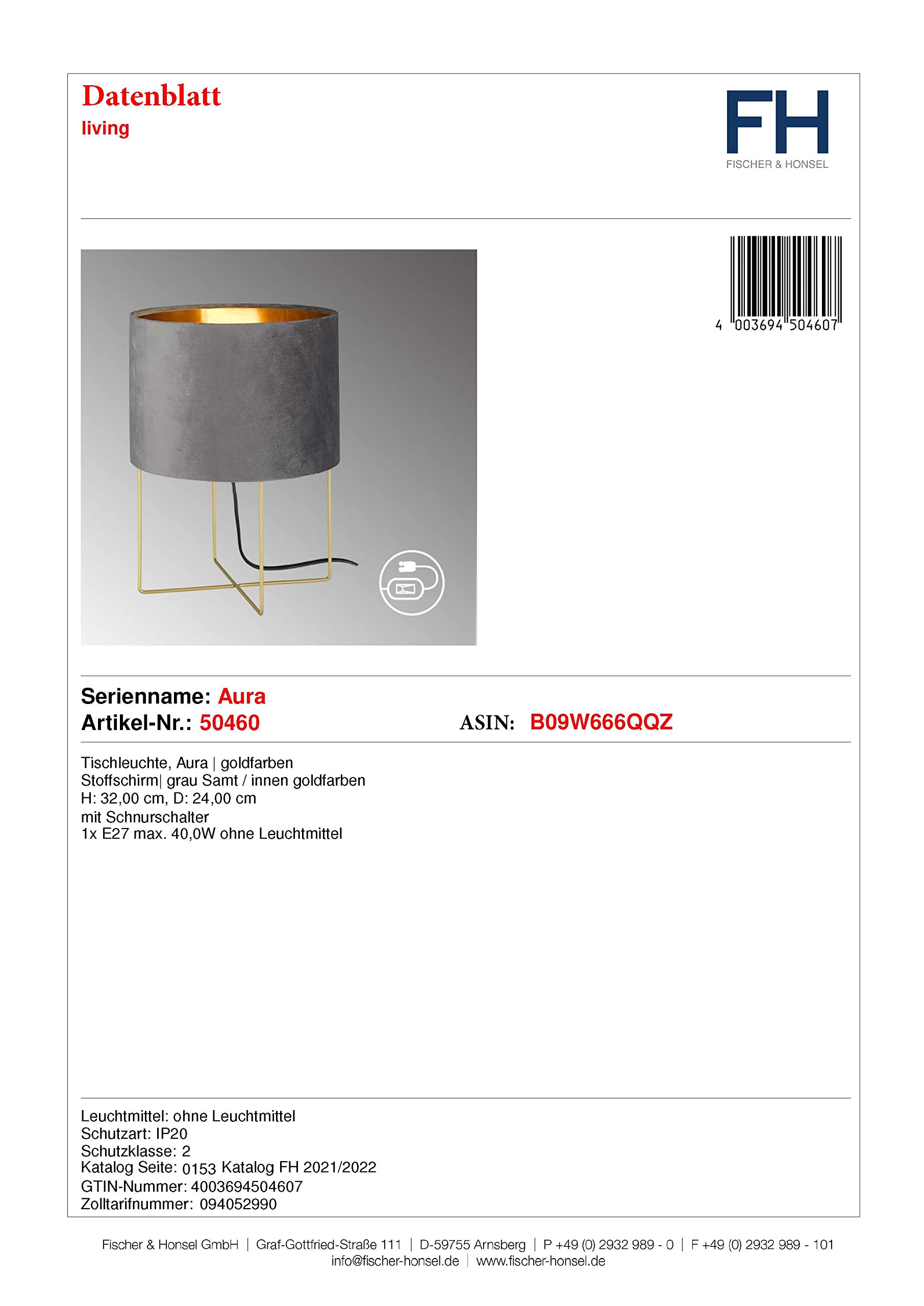 Fischer & Honsel Aura 50460 Table Lamp, Gold Colour, Fabric Shade